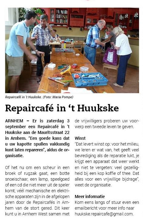 Repaircafé 28 augustus 202221 december 2022huukskeadmin Repaircafé zaterdag 3 septembertussen 10.30 en 13.00 uur Dit delen: Delen op X (Opent in een nieuw venster) X Share op Facebook (Opent in een nieuw venster) Facebook Vind-ik-leuk Aan het laden... Gerelateerd
