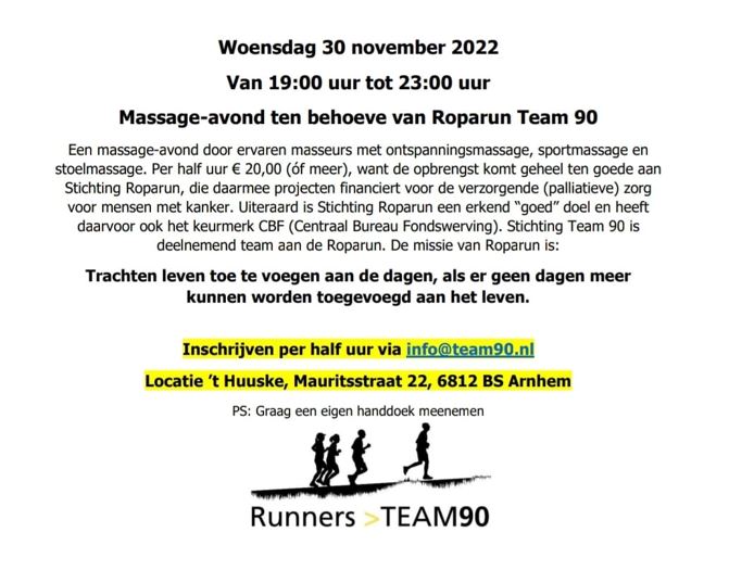 Massage-avond tbv. Roparun 16 november 202221 december 2022huukskeadmin Dit delen: Delen op X (Opent in een nieuw venster) X Share op Facebook (Opent in een nieuw venster) Facebook Vind-ik-leuk Aan het laden... Gerelateerd