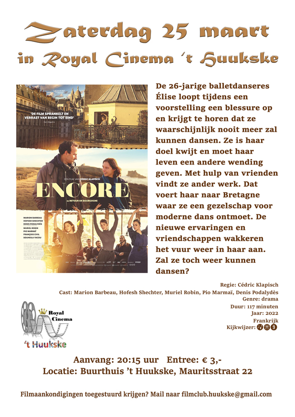 Op zaterdag 25 maart om 20.15 uur draaien we nog eens een film in Cinema Royal ’t Huukske, namelijk Encore. We starten deze dans-film na de maaltijd van Prins Heerlijk. Wil je weten waar hij over gaat? Lees dan even verder… of bekijk hieronder de trailer.