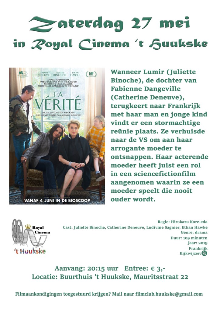 Op zaterdag 27 mei om 20.15 uur draaien we de film La Verité in Cinema Royal ’t Huukske. Oorspronkelijk stond op 27 mei Presque gepland, maar dat wordt La Verité, óók mooi met bekende actrices als Juliette Binoche en Catherine Deneuve. We starten deze film na de maaltijd (en afwas) van Prins Heerlijk. Lees hieronder meer over de inhoud of bekijk de trailer.