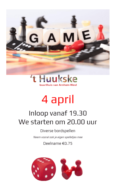 Hou je ook van spelletjes? En vind je het leuk om “spelenderwijs” nieuwe mensen te leren kennen? Jij speelt graag Risk, Monopoly, Catan, Skibbo, Scrabble -of elk ander bordspel-, maar je vindt niet altijd de meest geschikte tegenstander, of je hebt niet genoeg medespelers. Misschien vind je het wel gewoon leuk om nieuwe mensen te leren kennen. Kom dan geheel vrijblijvend naar ’t Huukske. Neem vooral ook je favoriete spel mee. Wij hebben hier ook spellen liggen en zorgen voor een warm onthaal.