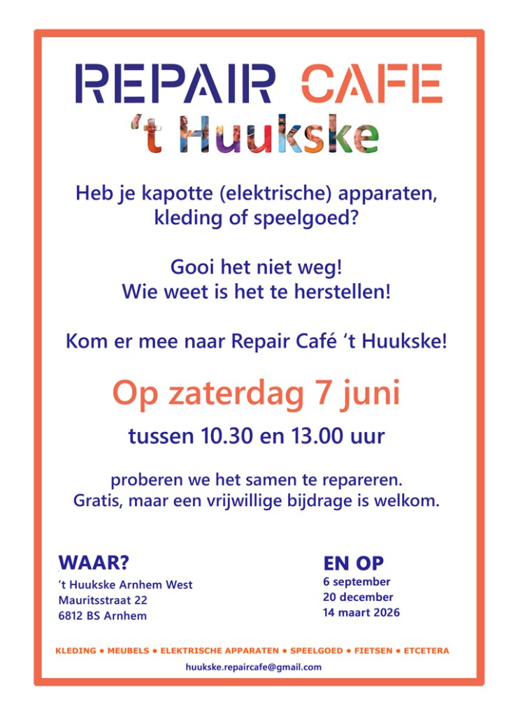 voorkomen van materiaalverspilling, mail dan naar huukske.repaircafe@gmail.com