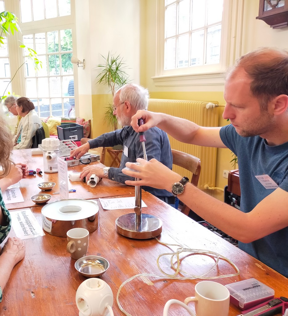 Of het nu om hedendaagse apparaten gaat of een ouder voorwerp waar je aan gehecht bent, de reparateurs zitten er klaar voor. Meer dan de helft van de reparatieverzoeken worden succesvol uitgevoerd. Citruspers, grasmaaier, lamp, winkelhaak in een broek, eierwekker, mixer, rugzak, rollator, enzovoort: veel voorwerpen zijn al van de schroothoop gered. Een leuke bijkomstigheid is dat reparaties gratis zijn (vrijwillige bijdrage is welkom), dat je er wat van kan leren èn dat je weer eens andere buurtbewoners ontmoet. De deur van ’t Huukske staat op deze zaterdagmorgen ook open voor een kop koffie of thee, om inspiratie op te doen of voor een reparatieadvies.