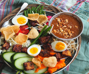 en o.a. een gekookt ei, tempé, kroepoek en pindasaus.